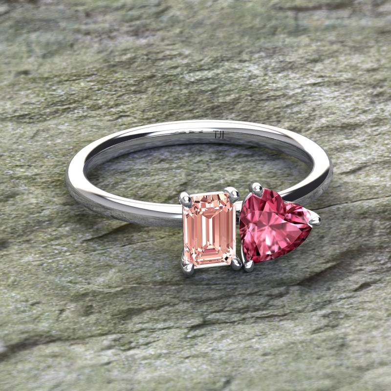Simple and beautiful, this enchanting 2 Stone Duo Ring flaunting an Emerald Shape Morganite dazzling along with Heart Shape Pink Tourmaline are perfect for the women who have a modern outlook and are willing to be unique.