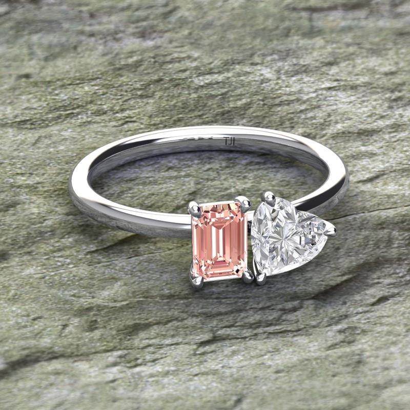Simple and beautiful, this enchanting 2 Stone Duo Ring flaunting an Emerald Shape Morganite dazzling along with Heart Shape White Sapphire are perfect for the women who have a modern outlook and are willing to be unique.