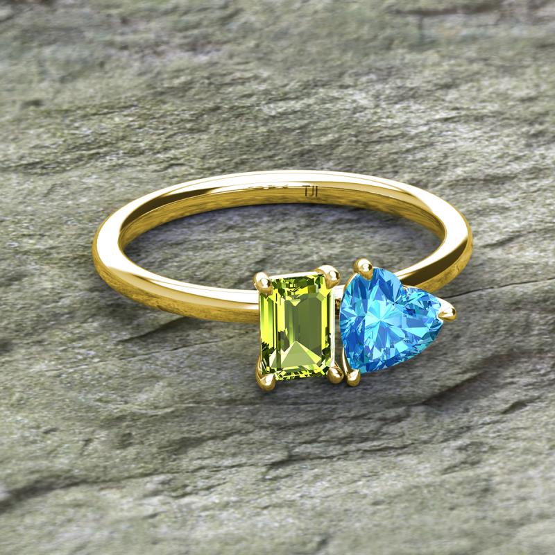 Simple and beautiful, this enchanting 2 Stone Duo Ring flaunting an Emerald Shape Peridot dazzling along with Heart Shape Blue Topaz are perfect for the women who have a modern outlook and are willing to be unique.
