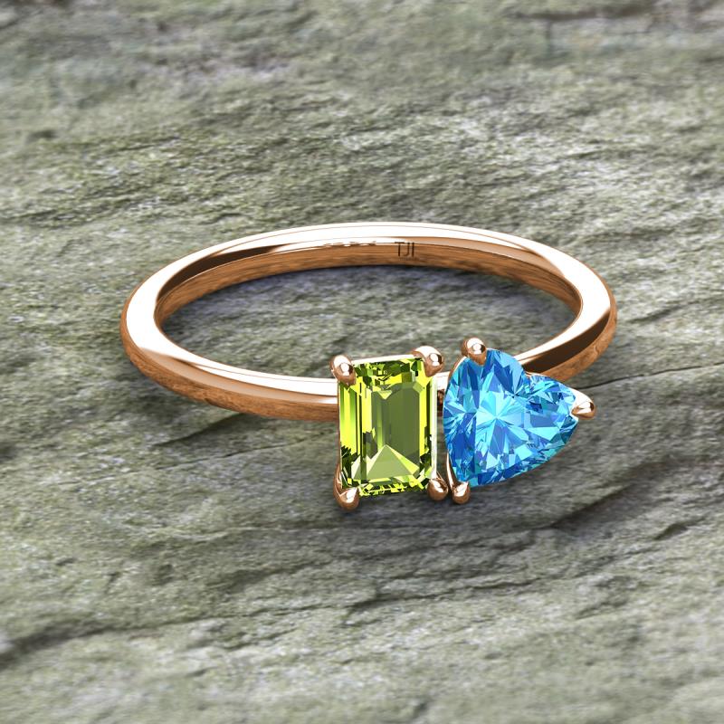 Simple and beautiful, this enchanting 2 Stone Duo Ring flaunting an Emerald Shape Peridot dazzling along with Heart Shape Blue Topaz are perfect for the women who have a modern outlook and are willing to be unique.