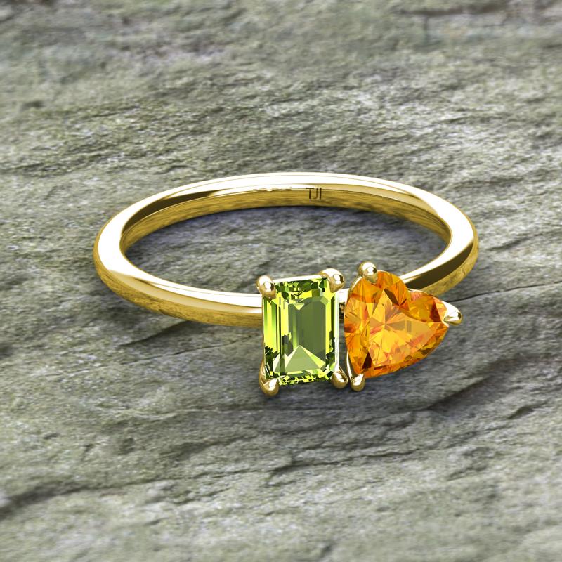Simple and beautiful, this enchanting 2 Stone Duo Ring flaunting an Emerald Shape Peridot dazzling along with Heart Shape Citrine are perfect for the women who have a modern outlook and are willing to be unique.