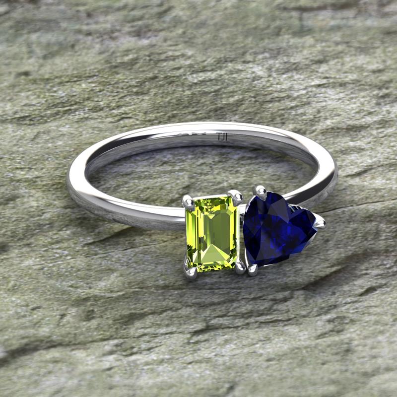 Simple and beautiful, this enchanting 2 Stone Duo Ring flaunting an Emerald Shape Peridot dazzling along with Heart Shape Lab Created Blue Sapphire are perfect for the women who have a modern outlook and are willing to be unique.