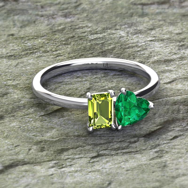 Simple and beautiful, this enchanting 2 Stone Duo Ring flaunting an Emerald Shape Peridot dazzling along with Heart Shape Lab Created Emerald are perfect for the women who have a modern outlook and are willing to be unique.