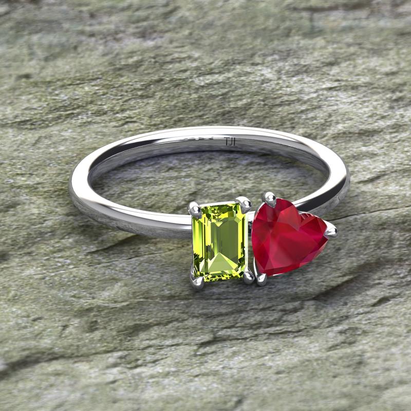 Simple and beautiful, this enchanting 2 Stone Duo Ring flaunting an Emerald Shape Peridot dazzling along with Heart Shape Lab Created Ruby are perfect for the women who have a modern outlook and are willing to be unique.