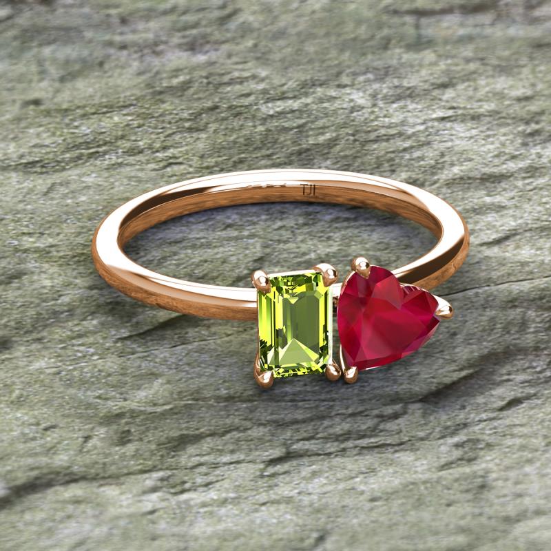 Simple and beautiful, this enchanting 2 Stone Duo Ring flaunting an Emerald Shape Peridot dazzling along with Heart Shape Lab Created Ruby are perfect for the women who have a modern outlook and are willing to be unique.