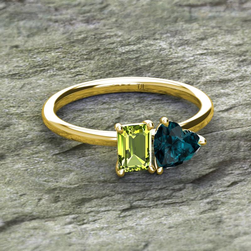 Simple and beautiful, this enchanting 2 Stone Duo Ring flaunting an Emerald Shape Peridot dazzling along with Heart Shape London Blue Topaz are perfect for the women who have a modern outlook and are willing to be unique.