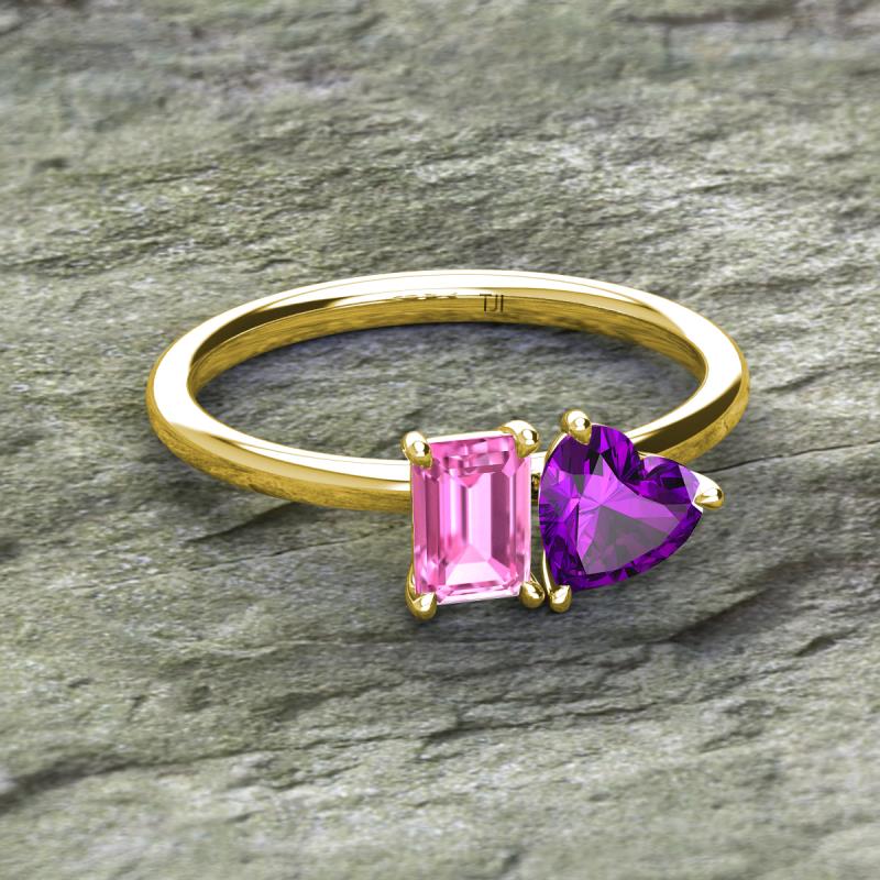 Simple and beautiful, this enchanting 2 Stone Duo Ring flaunting an Emerald Shape Pink Sapphire dazzling along with Heart Shape Amethyst are perfect for the women who have a modern outlook and are willing to be unique.