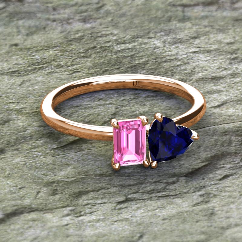 Simple and beautiful, this enchanting 2 Stone Duo Ring flaunting an Emerald Shape Pink Sapphire dazzling along with Heart Shape Lab Created Blue Sapphire are perfect for the women who have a modern outlook and are willing to be unique.