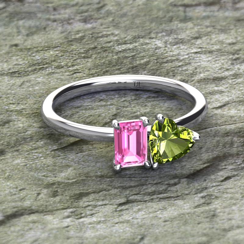 Simple and beautiful, this enchanting 2 Stone Duo Ring flaunting an Emerald Shape Pink Sapphire dazzling along with Heart Shape Peridot are perfect for the women who have a modern outlook and are willing to be unique.