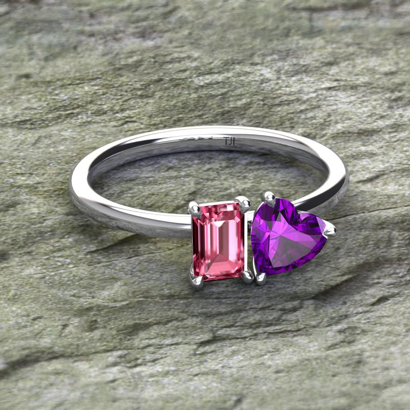 Simple and beautiful, this enchanting 2 Stone Duo Ring flaunting an Emerald Shape Pink Tourmaline dazzling along with Heart Shape Amethyst are perfect for the women who have a modern outlook and are willing to be unique.