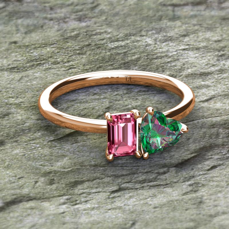 Simple and beautiful, this enchanting 2 Stone Duo Ring flaunting an Emerald Shape Pink Tourmaline dazzling along with Heart Shape Lab Created Alexandrite are perfect for the women who have a modern outlook and are willing to be unique.