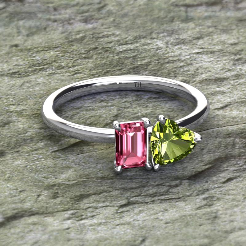 Simple and beautiful, this enchanting 2 Stone Duo Ring flaunting an Emerald Shape Pink Tourmaline dazzling along with Heart Shape Peridot are perfect for the women who have a modern outlook and are willing to be unique.