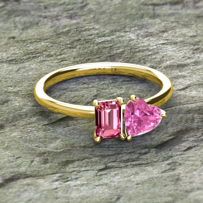 Simple and beautiful, this enchanting 2 Stone Duo Ring flaunting an Emerald Shape Pink Tourmaline dazzling along with Heart Shape Pink Sapphire are perfect for the women who have a modern outlook and are willing to be unique.