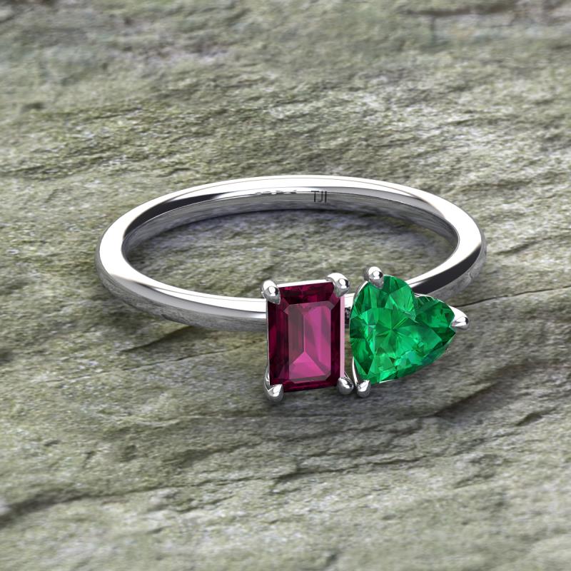 Simple and beautiful, this enchanting 2 Stone Duo Ring flaunting an Emerald Shape Rhodolite Garnet dazzling along with Heart Shape Lab Created Emerald are perfect for the women who have a modern outlook and are willing to be unique.
