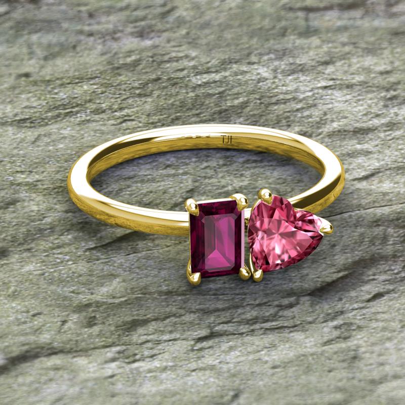 Simple and beautiful, this enchanting 2 Stone Duo Ring flaunting an Emerald Shape Rhodolite Garnet dazzling along with Heart Shape Pink Tourmaline are perfect for the women who have a modern outlook and are willing to be unique.