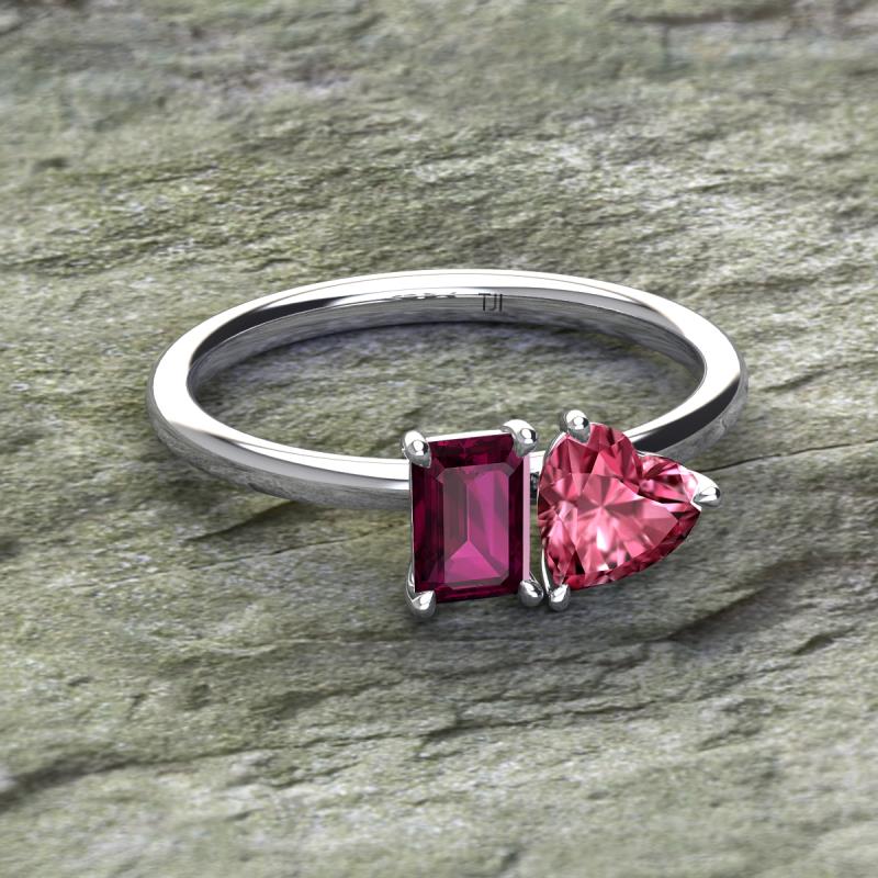 Simple and beautiful, this enchanting 2 Stone Duo Ring flaunting an Emerald Shape Rhodolite Garnet dazzling along with Heart Shape Pink Tourmaline are perfect for the women who have a modern outlook and are willing to be unique.