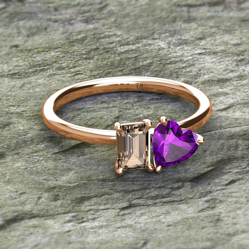 Simple and beautiful, this enchanting 2 Stone Duo Ring flaunting an Emerald Shape Smoky Quartz dazzling along with Heart Shape Amethyst are perfect for the women who have a modern outlook and are willing to be unique.