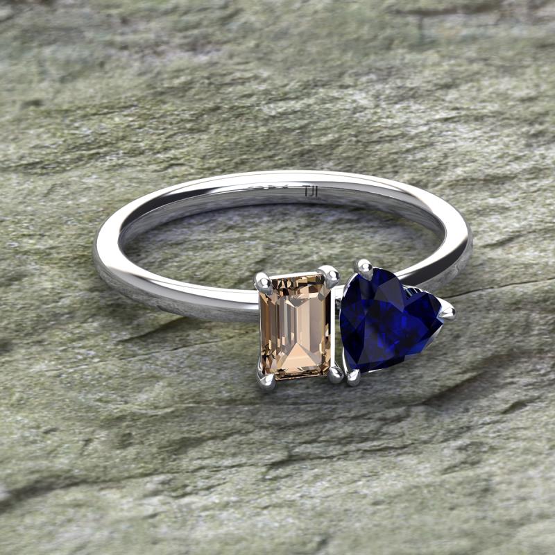 Simple and beautiful, this enchanting 2 Stone Duo Ring flaunting an Emerald Shape Smoky Quartz dazzling along with Heart Shape Lab Created Blue Sapphire are perfect for the women who have a modern outlook and are willing to be unique.