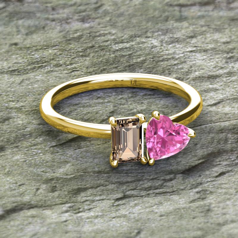 Simple and beautiful, this enchanting 2 Stone Duo Ring flaunting an Emerald Shape Smoky Quartz dazzling along with Heart Shape Lab Created Pink Sapphire are perfect for the women who have a modern outlook and are willing to be unique.