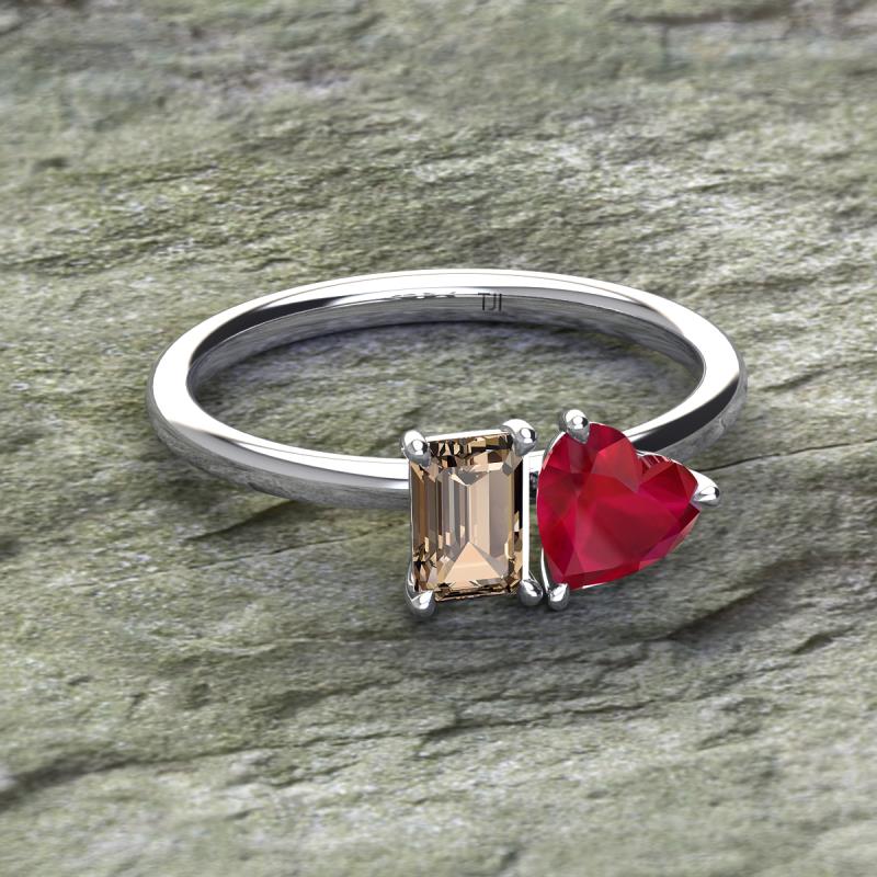 Simple and beautiful, this enchanting 2 Stone Duo Ring flaunting an Emerald Shape Smoky Quartz dazzling along with Heart Shape Lab Created Ruby are perfect for the women who have a modern outlook and are willing to be unique.