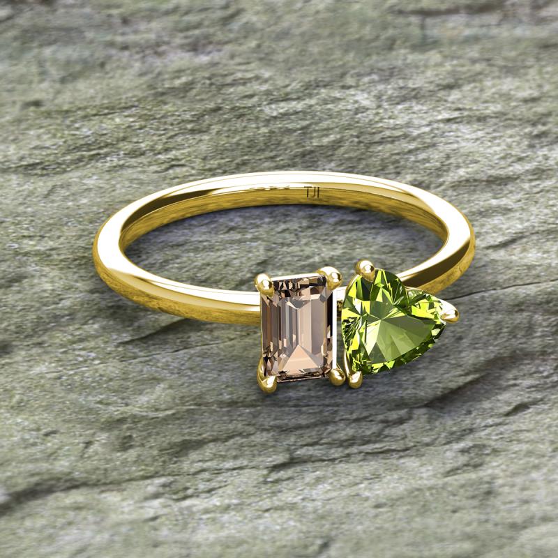 Simple and beautiful, this enchanting 2 Stone Duo Ring flaunting an Emerald Shape Smoky Quartz dazzling along with Heart Shape Peridot are perfect for the women who have a modern outlook and are willing to be unique.