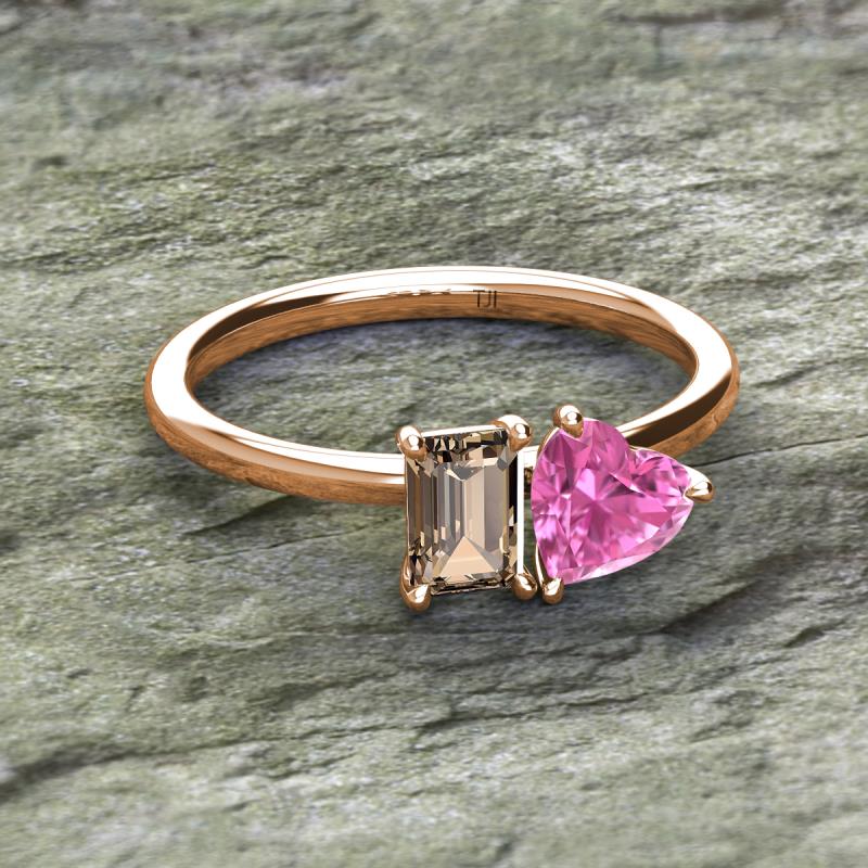 Simple and beautiful, this enchanting 2 Stone Duo Ring flaunting an Emerald Shape Smoky Quartz dazzling along with Heart Shape Pink Sapphire are perfect for the women who have a modern outlook and are willing to be unique.