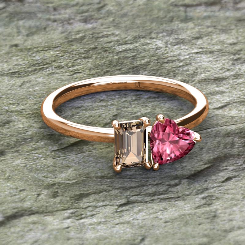 Simple and beautiful, this enchanting 2 Stone Duo Ring flaunting an Emerald Shape Smoky Quartz dazzling along with Heart Shape Pink Tourmaline are perfect for the women who have a modern outlook and are willing to be unique.