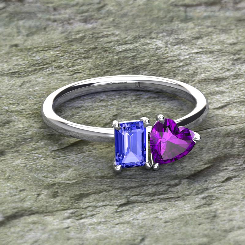 Simple and beautiful, this enchanting 2 Stone Duo Ring flaunting an Emerald Shape Tanzanite dazzling along with Heart Shape Amethyst are perfect for the women who have a modern outlook and are willing to be unique.