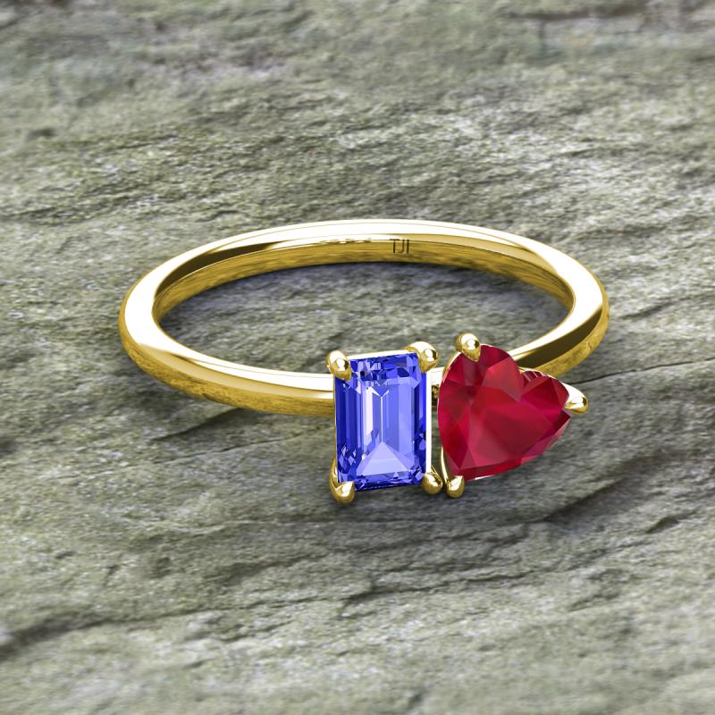 Simple and beautiful, this enchanting 2 Stone Duo Ring flaunting an Emerald Shape Tanzanite dazzling along with Heart Shape Lab Created Ruby are perfect for the women who have a modern outlook and are willing to be unique.