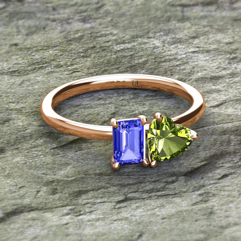 Simple and beautiful, this enchanting 2 Stone Duo Ring flaunting an Emerald Shape Tanzanite dazzling along with Heart Shape Peridot are perfect for the women who have a modern outlook and are willing to be unique.