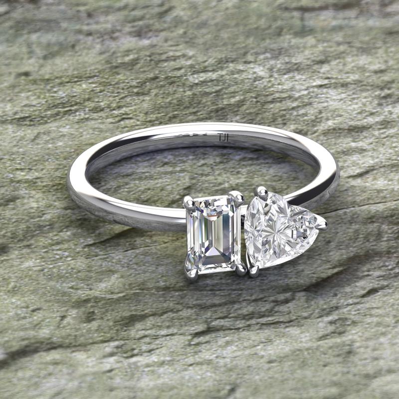 Simple and beautiful, this enchanting 2 Stone Duo Ring flaunting a GIA Certified Emerald Shape Diamond dazzling along with Heart Shape Lab Created White Sapphire are perfect for the women who have a modern outlook and are willing to be unique.