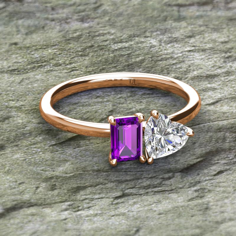 Simple and beautiful, this enchanting 2 Stone Duo Ring flaunting an Emerald Shape Amethyst dazzling along with GIA Certified Heart Shape Diamond are perfect for the women who have a modern outlook and are willing to be unique.