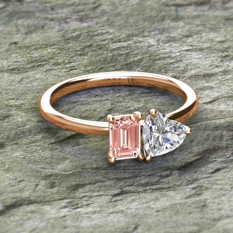 Simple and beautiful, this enchanting 2 Stone Duo Ring flaunting an Emerald Shape Morganite dazzling along with GIA Certified Heart Shape Diamond are perfect for the women who have a modern outlook and are willing to be unique.