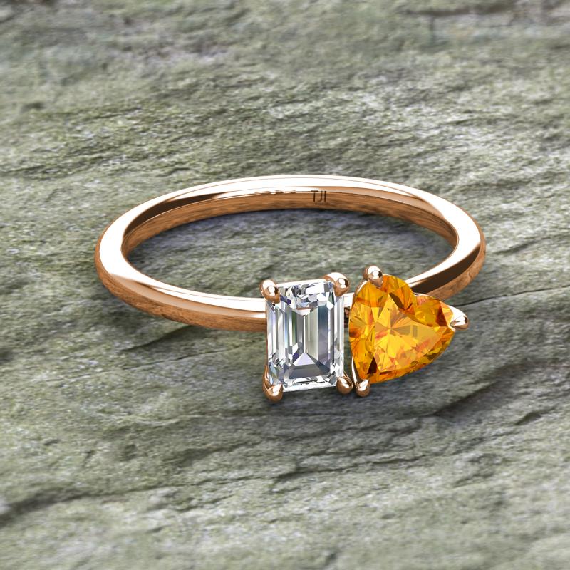 Simple and beautiful, this enchanting 2 Stone Duo Ring flaunting an IGI Certified Emerald Shape Lab Grown Diamond dazzling along with Heart Shape Citrine are perfect for the women who have a modern outlook and are willing to be unique.