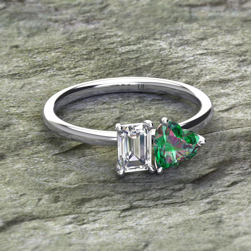 Simple and beautiful, this enchanting 2 Stone Duo Ring flaunting an IGI Certified Emerald Shape Lab Grown Diamond dazzling along with Heart Shape Lab Created Alexandrite are perfect for the women who have a modern outlook and are willing to be unique.