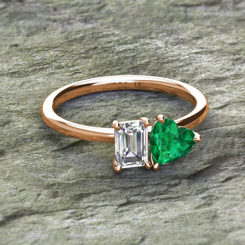 Simple and beautiful, this enchanting 2 Stone Duo Ring flaunting an IGI Certified Emerald Shape Lab Grown Diamond dazzling along with Heart Shape Lab Created Emerald are perfect for the women who have a modern outlook and are willing to be unique.
