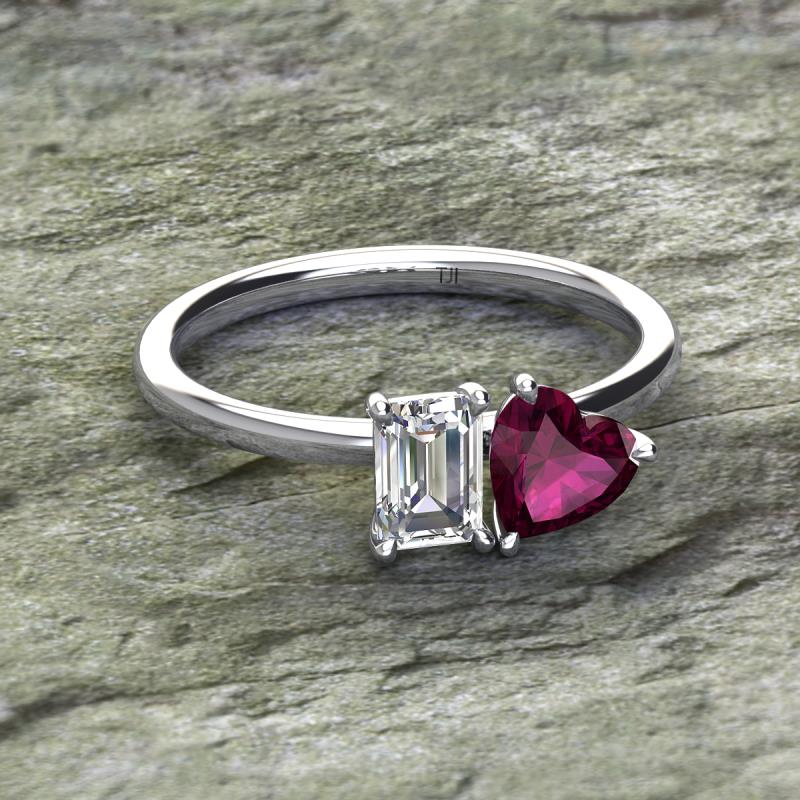 Simple and beautiful, this enchanting 2 Stone Duo Ring flaunting an IGI Certified Emerald Shape Lab Grown Diamond dazzling along with Heart Shape Rhodolite Garnet are perfect for the women who have a modern outlook and are willing to be unique.