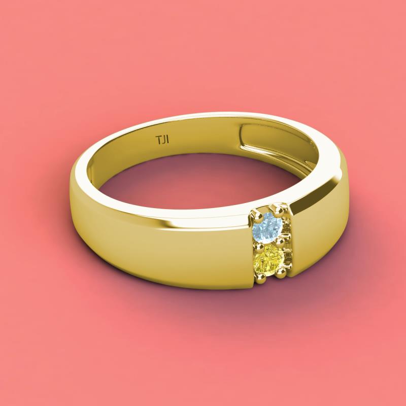 Don't be afraid of a little bling when it comes to men's wedding bands. This Men's Two Stone wedding band displays two Round shaped Aquamarine and Yellow Diamond aligned in a sophisticated prong setting on the thick and high polished metal band.