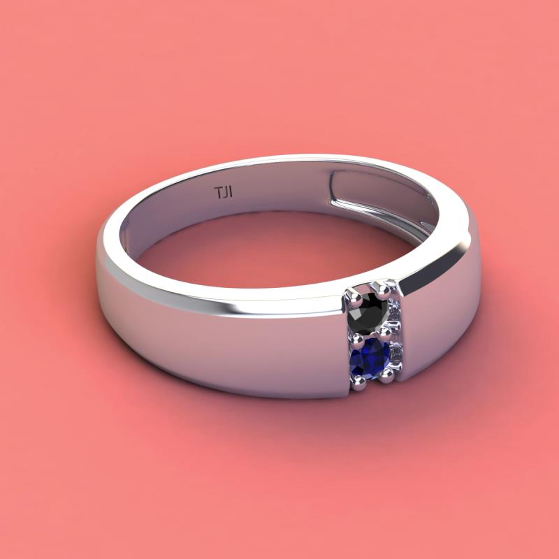 Don't be afraid of a little bling when it comes to men's wedding bands. This Men's Two Stone wedding band displays two Round shaped Black Diamond and Blue Sapphire aligned in a sophisticated prong setting on the thick and high polished metal band.