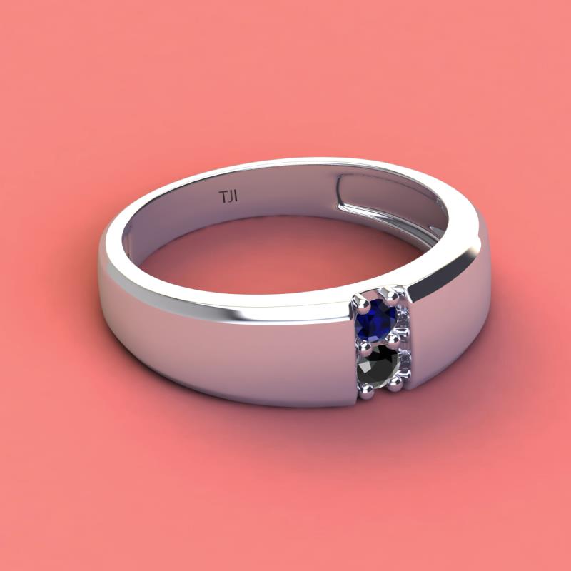 Don't be afraid of a little bling when it comes to men's wedding bands. This Men's Two Stone wedding band displays two Round shaped Blue Sapphire and Black Diamond aligned in a sophisticated prong setting on the thick and high polished metal band.