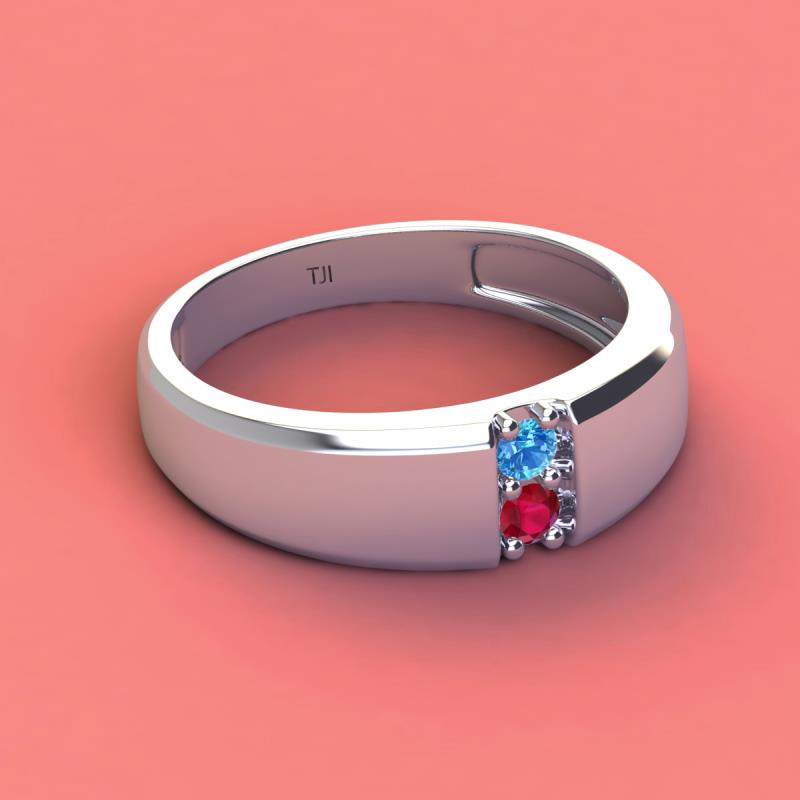 Don't be afraid of a little bling when it comes to men's wedding bands. This Men's Two Stone wedding band displays two Round shaped Blue Topaz and Ruby aligned in a sophisticated prong setting on the thick and high polished metal band.