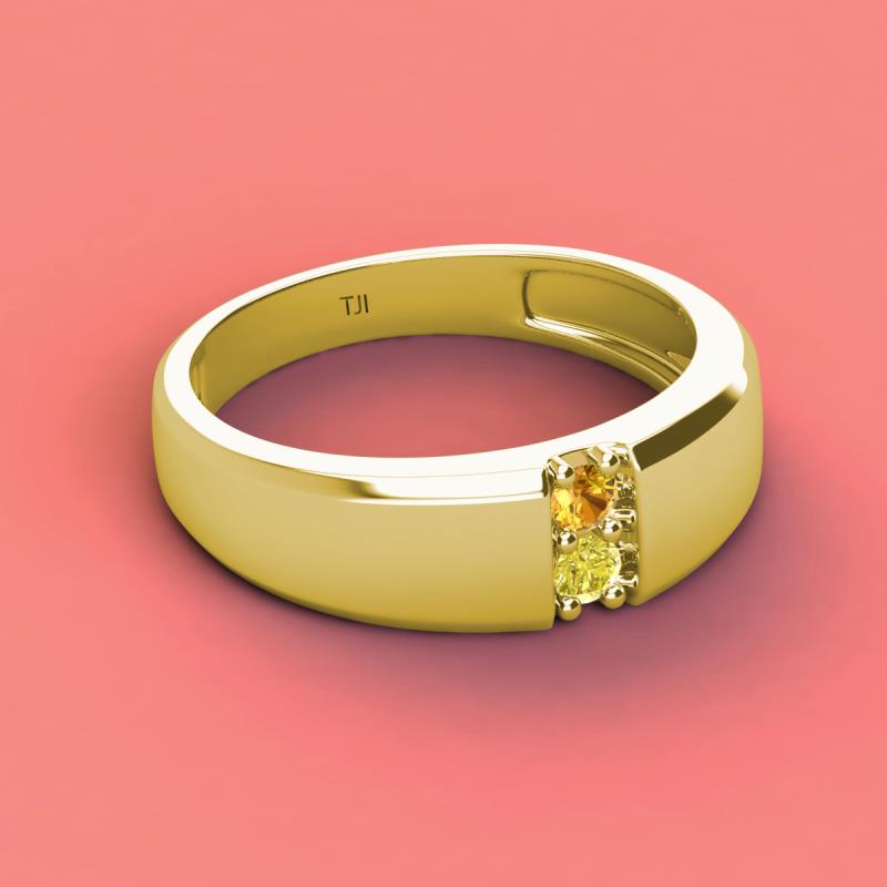 Don't be afraid of a little bling when it comes to men's wedding bands. This Men's Two Stone wedding band displays two Round shaped Citrine and Yellow Diamond aligned in a sophisticated prong setting on the thick and high polished metal band.