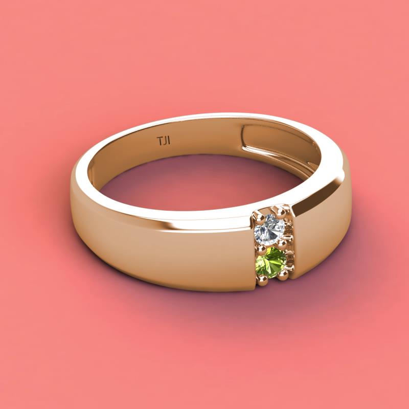 Round Forever Brilliant Moissanite and Peridot 0.21 ctw High Polished 2 Stone Men Wedding Band 14K Rose Gold More Details ...