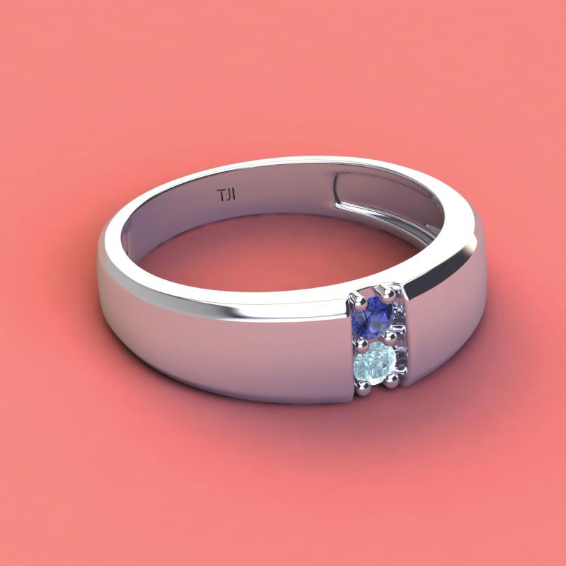 Don't be afraid of a little bling when it comes to men's wedding bands. This Men's Two Stone wedding band displays two Round shaped Iolite and Aquamarine aligned in a sophisticated prong setting on the thick and high polished metal band.