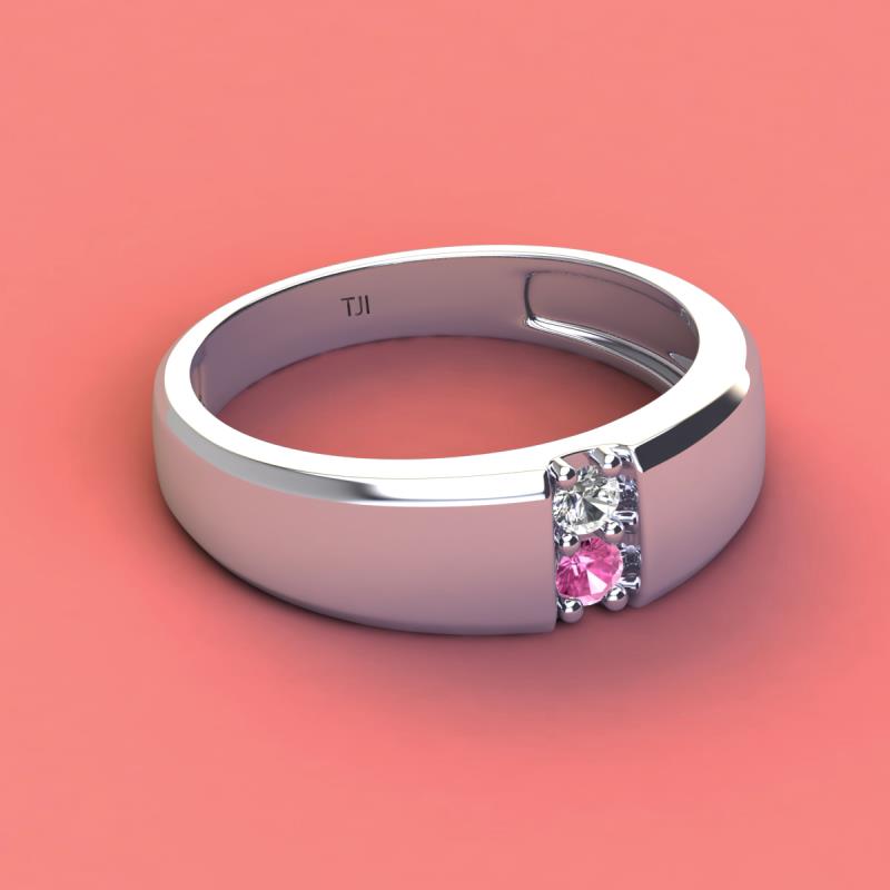 Don't be afraid of a little bling when it comes to men's wedding bands. This Men's Two Stone wedding band displays two Round shaped Lab Grown Diamond and Pink Sapphire aligned in a sophisticated prong setting on the thick and high polished metal band.