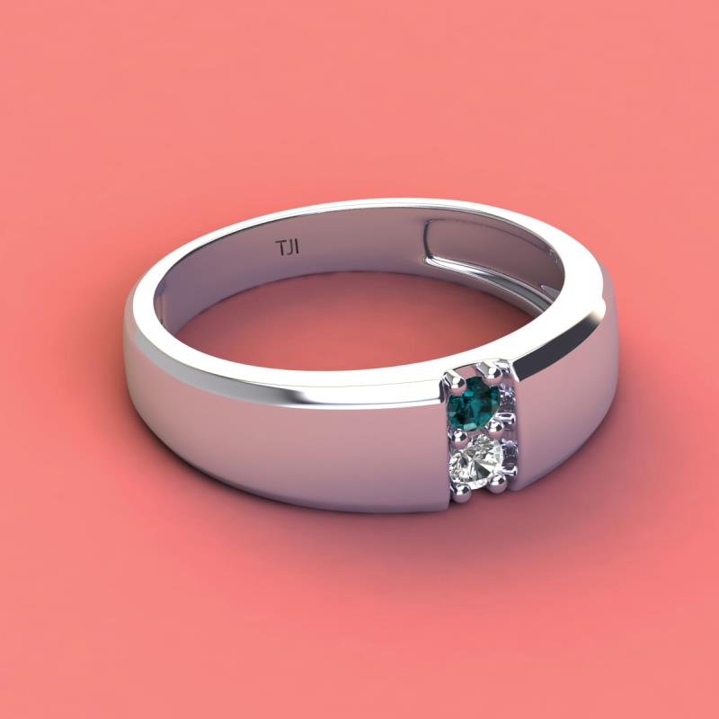 Don't be afraid of a little bling when it comes to men's wedding bands. This Men's Two Stone wedding band displays two Round shaped London Blue Topaz and Forever One Moissanite aligned in a sophisticated prong setting on the thick and high polished metal band.