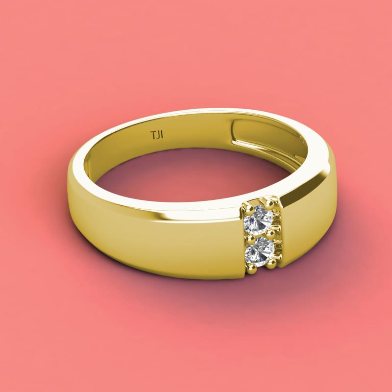 Don't be afraid of a little bling when it comes to men's wedding bands. This Men's Two Stone wedding band displays two Round shaped Natural Diamond and Moissanite aligned in a sophisticated prong setting on the thick and high polished metal band.