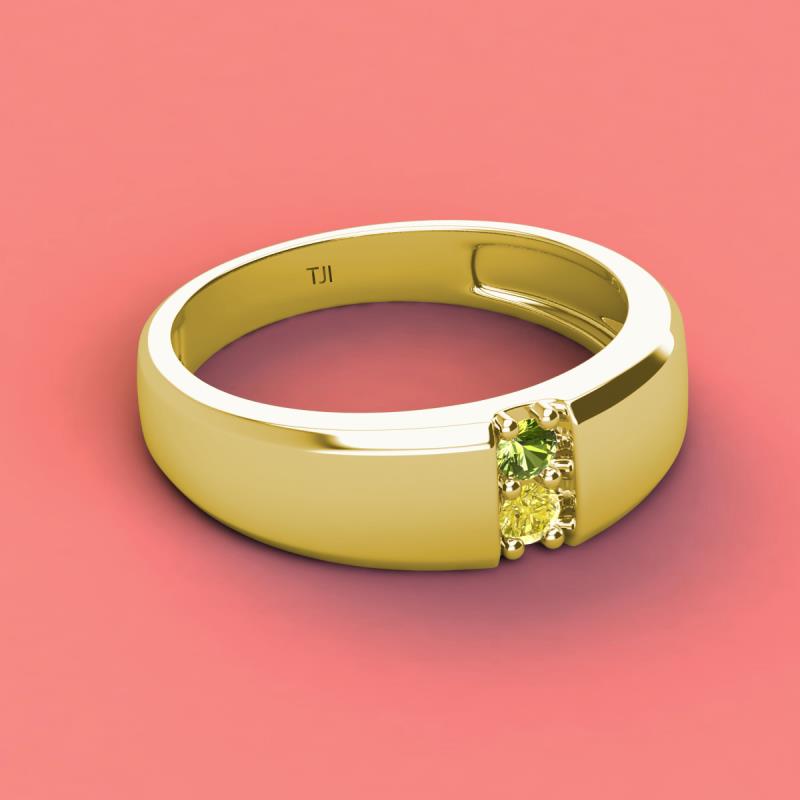 Don't be afraid of a little bling when it comes to men's wedding bands. This Men's Two Stone wedding band displays two Round shaped Peridot and Yellow Diamond aligned in a sophisticated prong setting on the thick and high polished metal band.