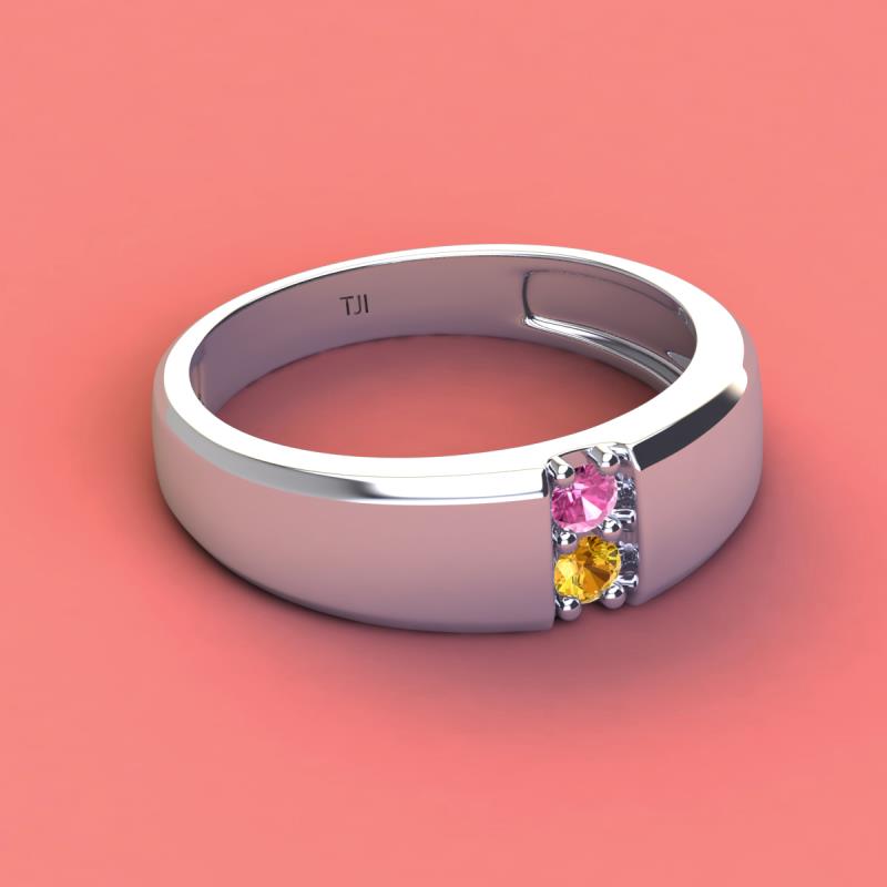 Don't be afraid of a little bling when it comes to men's wedding bands. This Men's Two Stone wedding band displays two Round shaped Pink Sapphire and Citrine aligned in a sophisticated prong setting on the thick and high polished metal band.