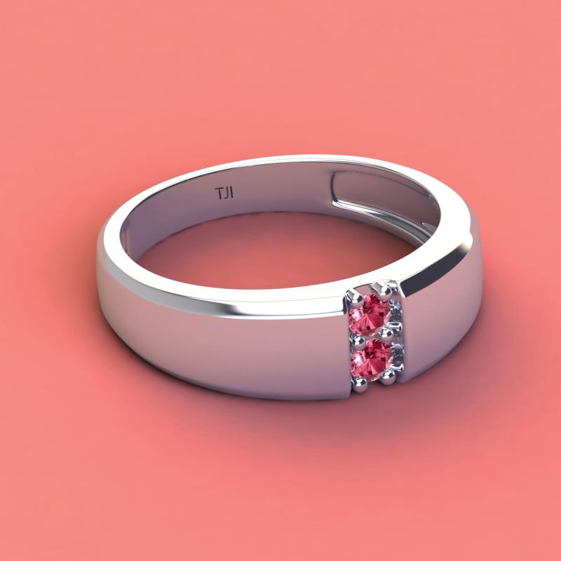 Don't be afraid of a little bling when it comes to men's wedding bands. This Men's Two Stone wedding band displays two Round shaped Pink Tourmaline aligned in a sophisticated prong setting on the thick and high polished metal band.